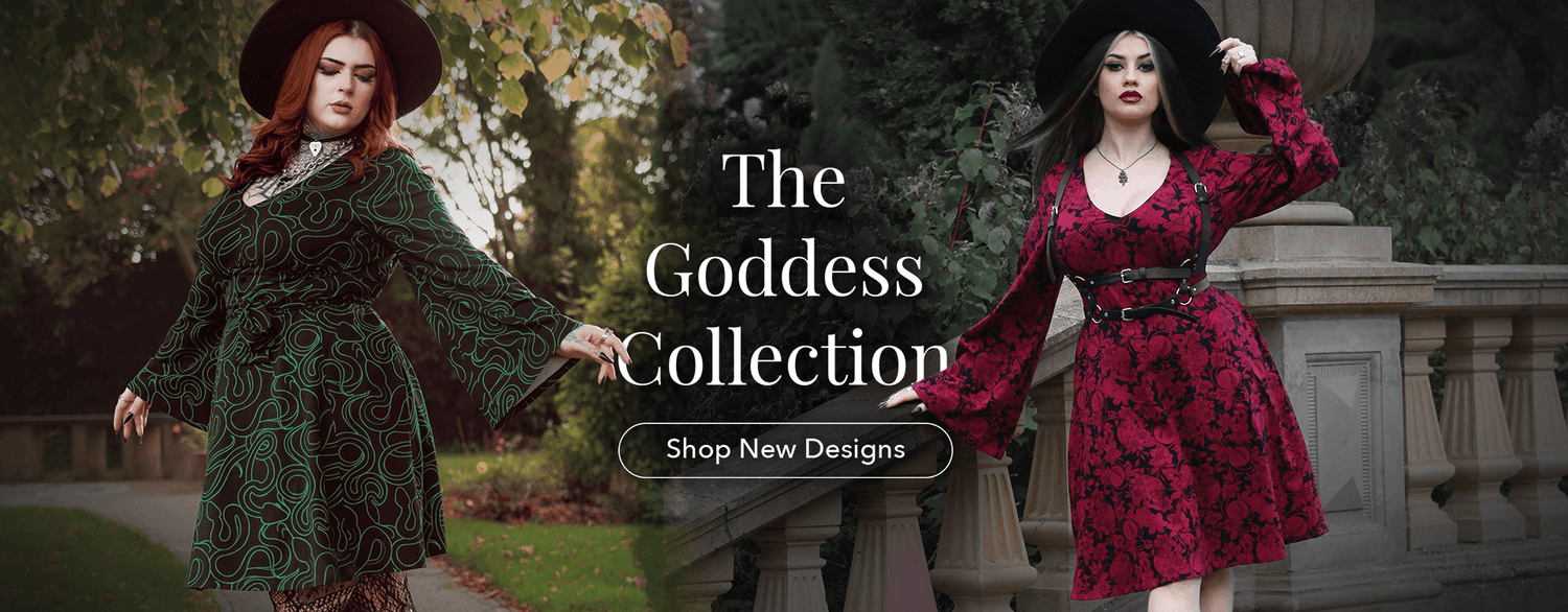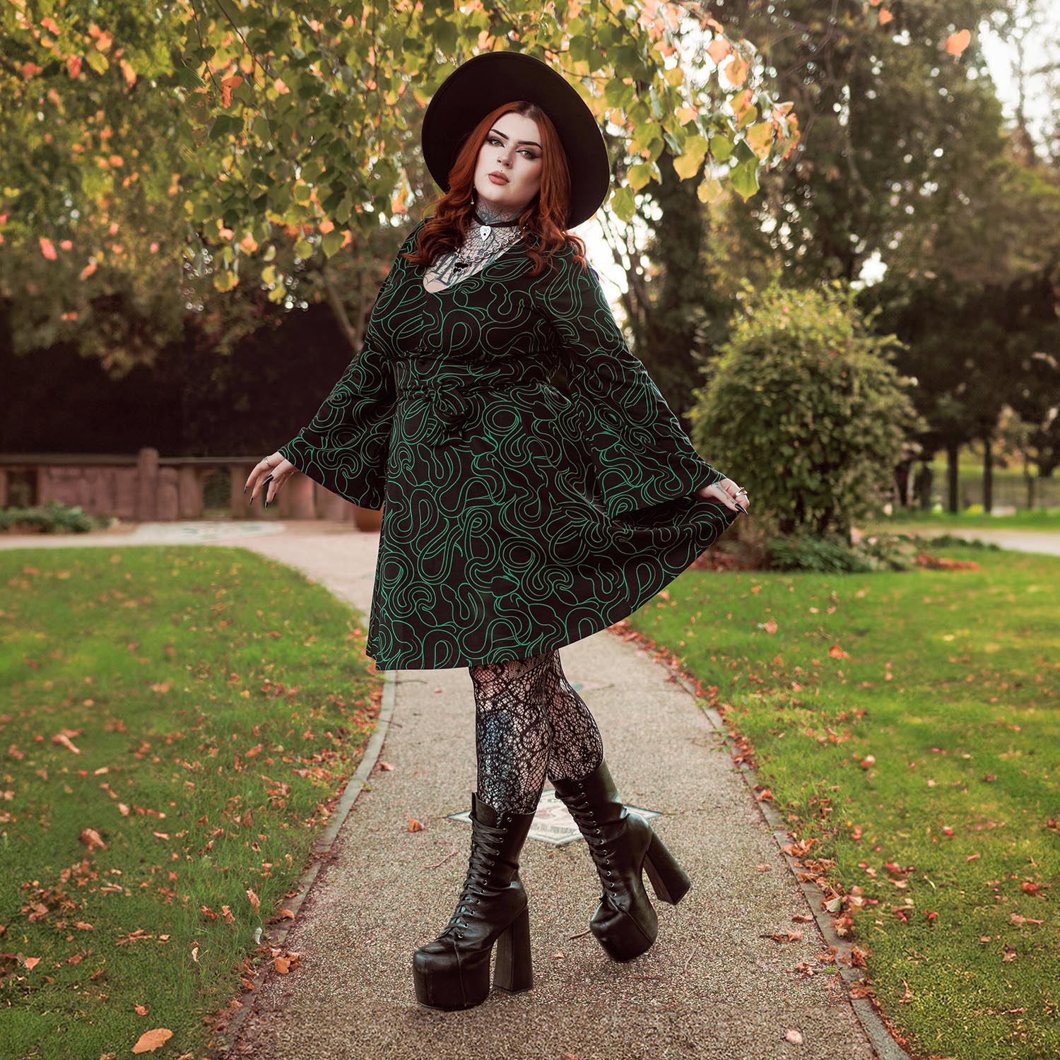 This collection is all about celebrating your own strength and resilience. Find your inner goddess with the mystical serpent print of the Corra Bell Sleeve Mini Dress in Foliage & Black. Or embrace a darker romantic style with the Danu Bell Sleeve Mini Dress in Blood Red, featuring a stunning skull and flower pattern. Both dresses offer a floaty shape, dramatic bell sleeves, and deep, functional pockets.