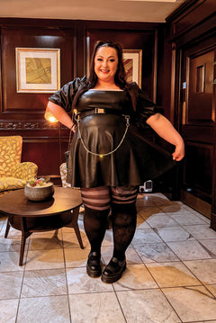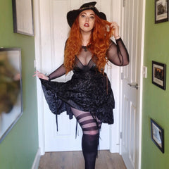 With a black opaque leg, that ends at the thigh, there are then sheer panels at the top of the legs with three stripes, this give the illusion of hold ups or striped thigh high socks. But these sheer panels are made from our super robust fishnet (the same as our sell out Brad tights). Perfect for peeking out under a skirt or dress, Ashniko are you new favourite black tights.