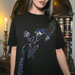 Step into the enchanted realm of Prythian with the SnagxACOTAR Bargain Tattoo ACOTAR T-Shirt. Inspired by Feyres bargain with Rhys, the original, hand-drawn design is applied with foil print, Holoshine, which makes it shimmer different colours depending on the starlight. This is a slouchy fit tee, made from organic cotton, perfect for femme or masc body shapes. Officially licensed ACOTAR merchandise, this tee is not just any apparel; it's a piece of the enduring ACOTAR saga that really fits.