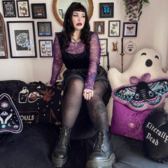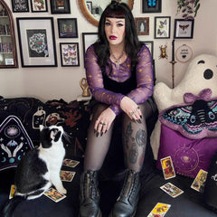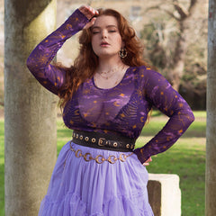 Like wearing the night sky. The Celestial Mesh Top in Purple and Gold is bold, vivid and impossible to ignore. A rich purple base is lit up with golden moons, stars and drifting constellations, taken from our in-house celestial print and reimagined on sheer mesh. It feels luminous, expressive and full of movement, catching the light and shifting with you as you go. The fit is designed to feel as good as it looks.