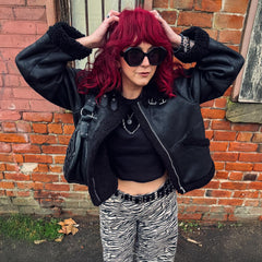 Buckle up and meet the Bessie Aviator Jacket in Black borg. This is aviator attitude wrapped in a teddy-bear hug. It is a vegan-friendly cropped jacket crafted from ultra-soft faux suede with plush borg trim on the collar and sleeve hems. Zip it up once and you are instantly wrapped in pure luxury that feels like stealing the duvet on a winter morning.