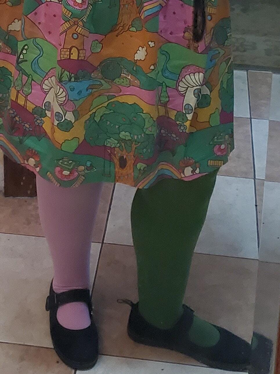 - Peas/Piglet colourway with one pea green leg and one soft piglet pink leg