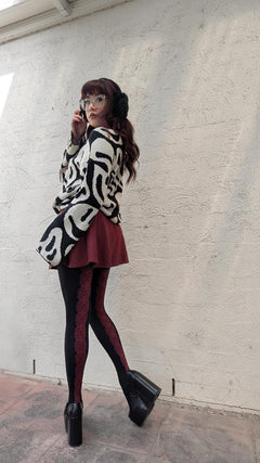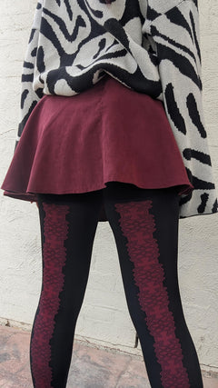 Ancient magic, made for modern bodies. The Entwined tights feature a stunning, intricate Celtic knot design that runs up the back of the legs in a bold, beautiful red. It’s a real statement piece that’s both powerful and elegant.