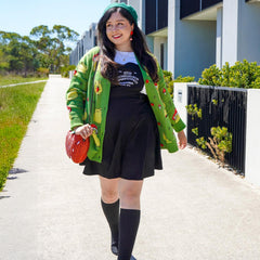 Our Hoppy Meadow Cardigan is guaranteed to make you smile. Set on a grass green background, this statement knit is covered in playful light green frogs, from strawberry-hugging cuties to frogs wearing tiny toadstool hats. Finished with five bright red buttons down the deep green placket, it's packed with joyful details that turn everyday outfits into something special.