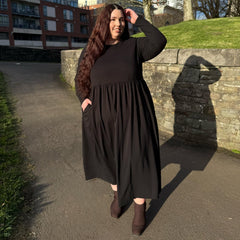 With its elegant round neckline, full-length sleeves and softly gathered waist, this dress creates a beautifully balanced silhouette that feels polished without ever feeling restrictive. The gentle shaping through the waist adds structure while still allowing the dress to move freely with you, and the full skirt brings a swish of drama and graceful movement. Deep, flat side pockets sit smoothly within the seams so you can carry your essentials without adding bulk.
