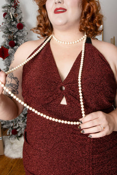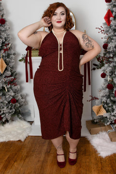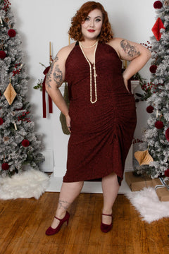Dazzle through party season with the Bordeaux Lurex Halter Dress, your sparkle-packed secret weapon. Deep Bordeaux red lurex shimmers like mulled wine under fairy lights, while silky-soft tie straps loop around the neck for a custom fit that never digs in. Dance from the first carol to the final countdown without a single adjustment.