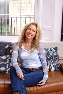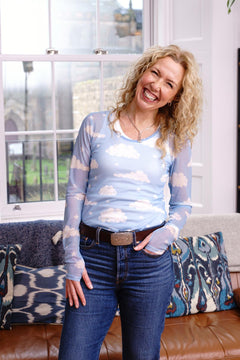 Float up and meet the Cloud Mesh Top. It is a semi-sheer top boasting our exclusive Cloud print with a gentle sky blue base scattered with billowy white clouds and a smattering of little stars.
