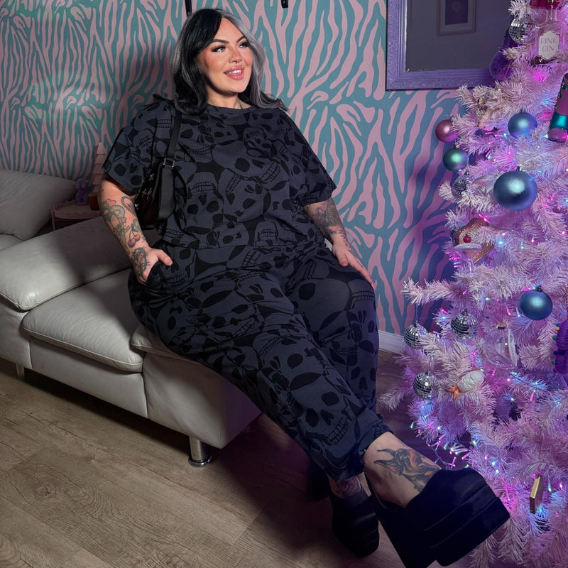 Hundreds of grinning skulls swirl across an inky base, giving proper moody vampire-lair energy. The set features our new boxy short-sleeve tee, cropped to sit just above the belly button so it kisses the high-waisted bottoms perfectly (no chilly gaps here). The bottoms are cuffed at the ankle with a comfy elasticated drawstring waist that feels like the gentlest midnight embrace.